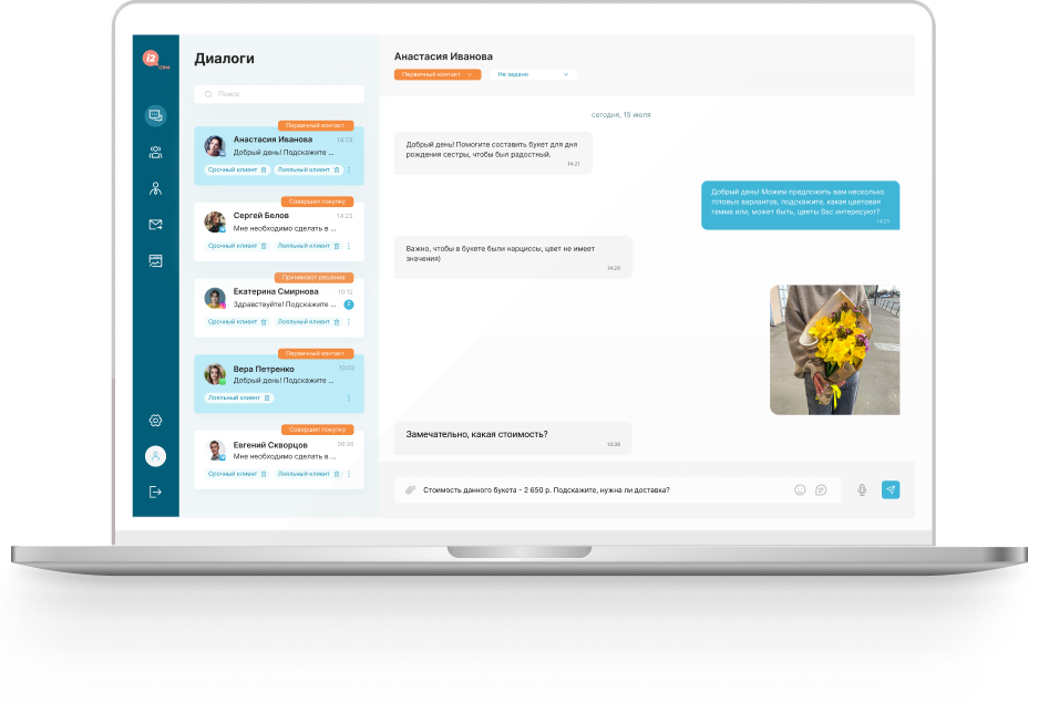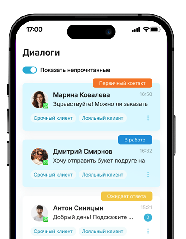 Помогут вам быстро понять, на каком этапе воронки продаж находится клиент. Кроме статусов доступны теги, с их помощью вы можете добавлять пометки в произвольной форме с информацией о клиенте.